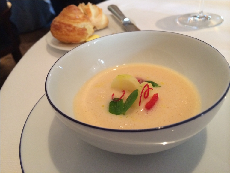 Melon Gazpacho / Hawaiian Hearts of Peach Palm, Lipstick Peppers, Sweet Curry, Pea Tendrils